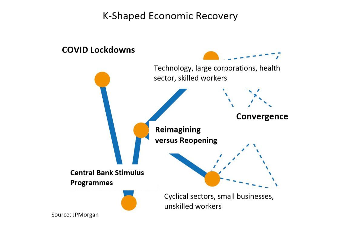 Durante estos estos últimos días, varios foros se han hecho eco que no habrá un rebote generalizado en forma de V, sino una recuperación asimétrica en forma de K, según apunta un informe de JP Morgan y donde habrá sectores/agentes intervinientes que irán hacia arriba y otros hacia abajo.